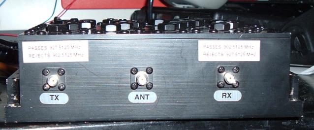 Duplexer - Lorch 900MHz self-contained deplexer. The duplexer is tuned to pass and reject a wide frequency range without any tuning. The duplexer uses SMA connectors, this was nice because we want to use somthing with as low loss as possible and SMA's are known for their low loss properties.