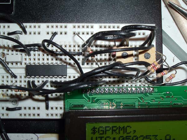 Here is a closeup of the PIC and LCD lines breadboarded.