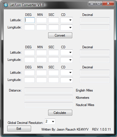 Lat/Lon Converter : Convert points to decimal andcalculates distance between two points Download: Lat/Lon Installer for XP and Vista To upgrade, you MUST UNINSTALL the older version! |