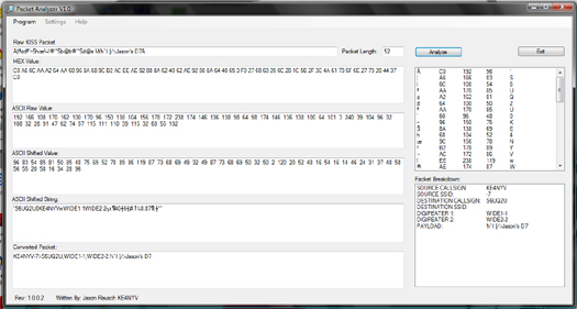 KISS Packet Analyzer : Paste in raw KISS packetsand get an instant conversion to human-readable form, as well as a complete breakdown of the packet in ASCII, HEX and individual elements! Download: KISS Packet Analyzer Installer for XP and Vista To upgrade, you MUST UNINSTALL the older version! |