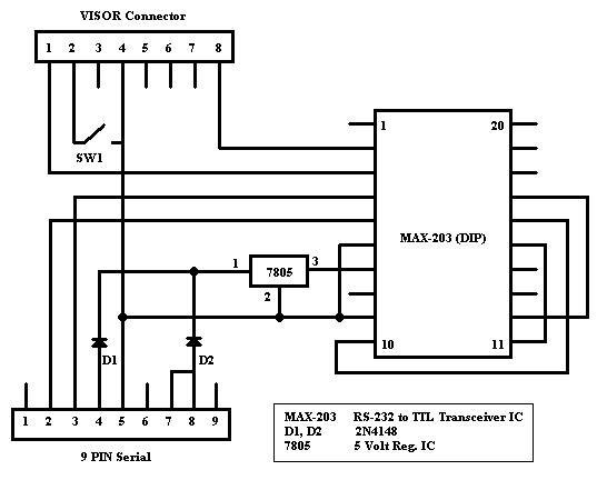This is a pretty basic design. This circuit will let your Handspring Palm talk to a serial device, specifically a TNC or modem. The circuit was originally designed to help people convert their USB hot-sync stands to serial so they could hot sync through a serial com port. That is why SW1 exists in the circuit. When open it will allow for serial data to flow feely. When the switch is connected the palm will act a little crazy or may not work at all. Since I only use my cables for packet and APRS and I have a seperate hot-sync cable, I just left this short out. The diodes are NOT a need, but they do help to prevent from a +5 VDC backfeed back into the port. Enjoy and good luck.